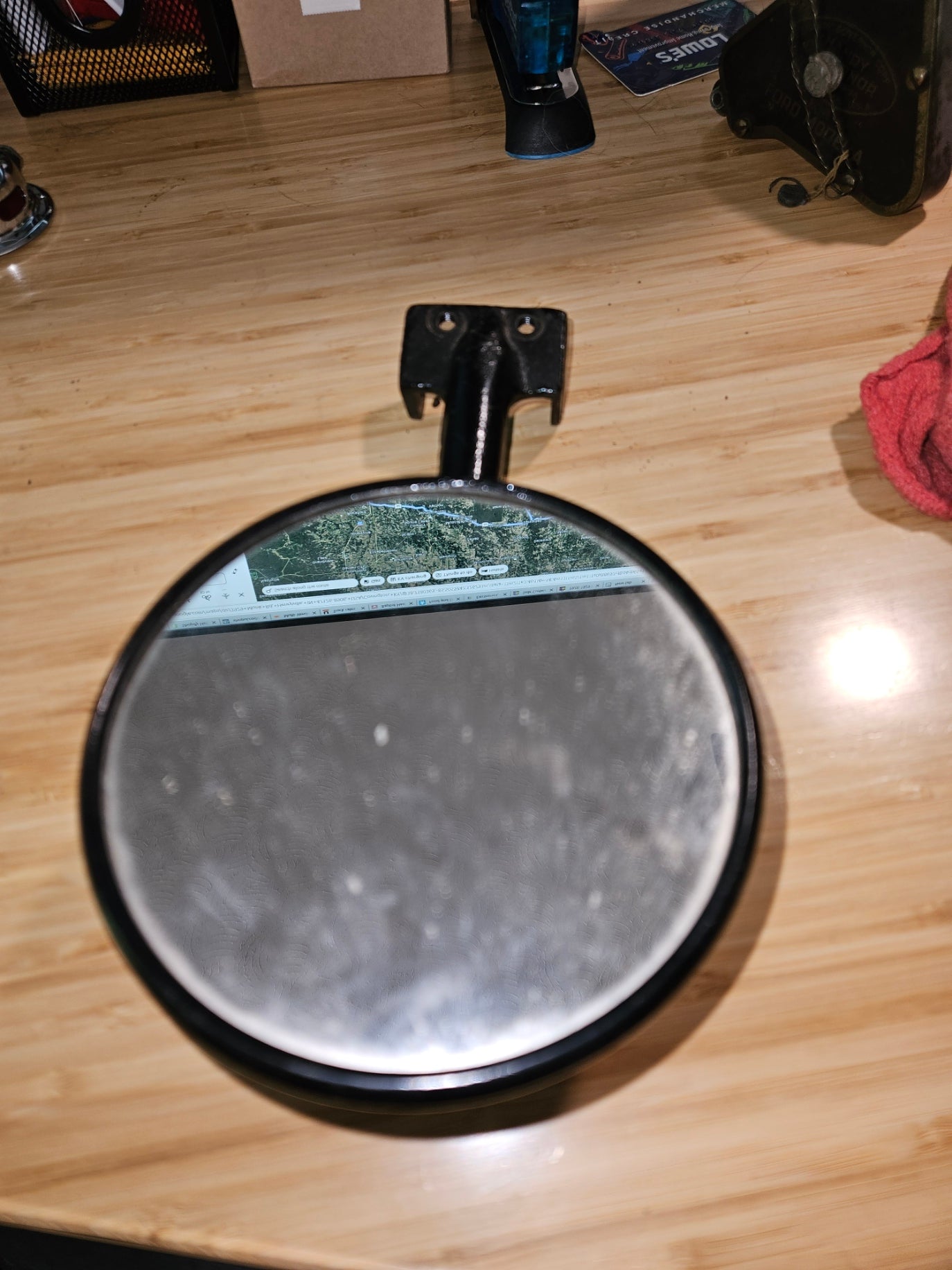 Vintage Hinge mirror. Hinge must be 1 5/8 or less to fit this mirror. Black in color where most are stainless.